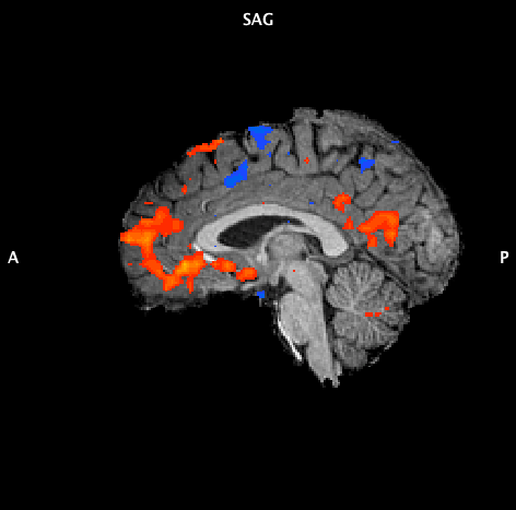 “The image shows functional connectivity during bliss and during ‘rest/blocking’. The yellow/red areas indicate areas of positive functional connectivity while blue/green indicate areas of negative functional connectivity. The bliss condition resulted in the overall increase of functional connectivity within the default mode network. This is also know as the intrinsic network, responsible for the sense of self and self-awareness. Increased connectivity was especially along its main axis – medial Prefrontal cortex (mPFC) – medial Parietal / Posterior Cingulate Cortex (PCC).“