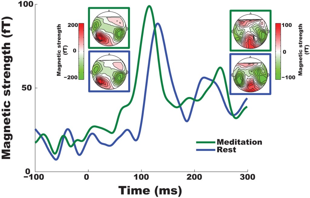 “Auditory responses of M100ms/200ms are observed in the waveform responses in both meditation/bliss (green line) and rest/non bliss (blue line) conditions. Topographies of magnetic field of the brain at M100 and M200 components are presented in the same color-coded box around the peak latency for each condition. At M100 we observed larger magnitude and shorter latency (faster processing) during bliss (compared to control condition). At M200 we observed lesser magnitude for bliss, but also a shorted latency (faster processing).“