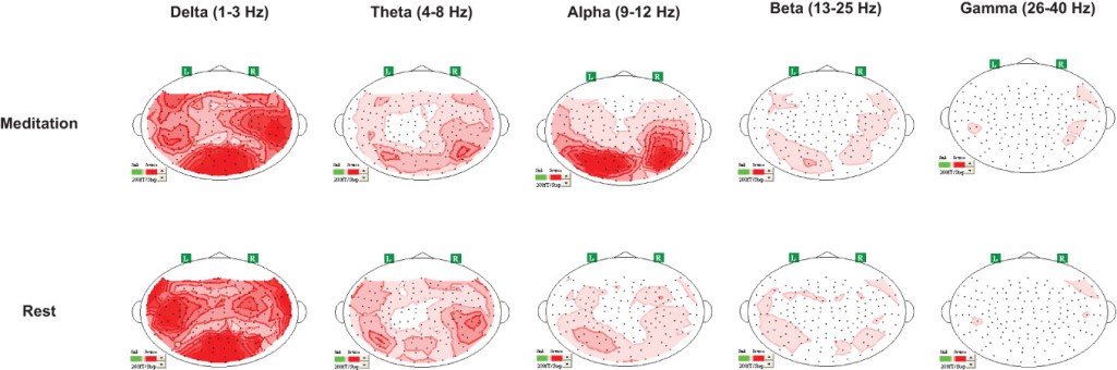 “The MEG showed an increase of amplitude of alpha frequency over the medial parietal area. The image shows response power for meditation (bliss) and rest (chew) in different frequency bands. There was more power for bliss in alpha and beta frequencies over the medial parietal region; less power for bliss in gamma over frontal and temporal regions. We could interpret these results, however speculatively, as a decrease of conceptual processing and an increase of relaxation and background awareness during bliss.”
