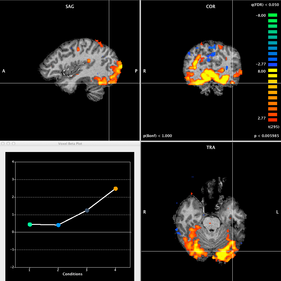 The second image shows increased activity in the left ventral striatum/Nucleus Accumbens which is sometimes referred to the pleasure centre of the brain. It receives dopamine projections from ventral tegmentum and has a big part to play in rewards and addiction. (2)